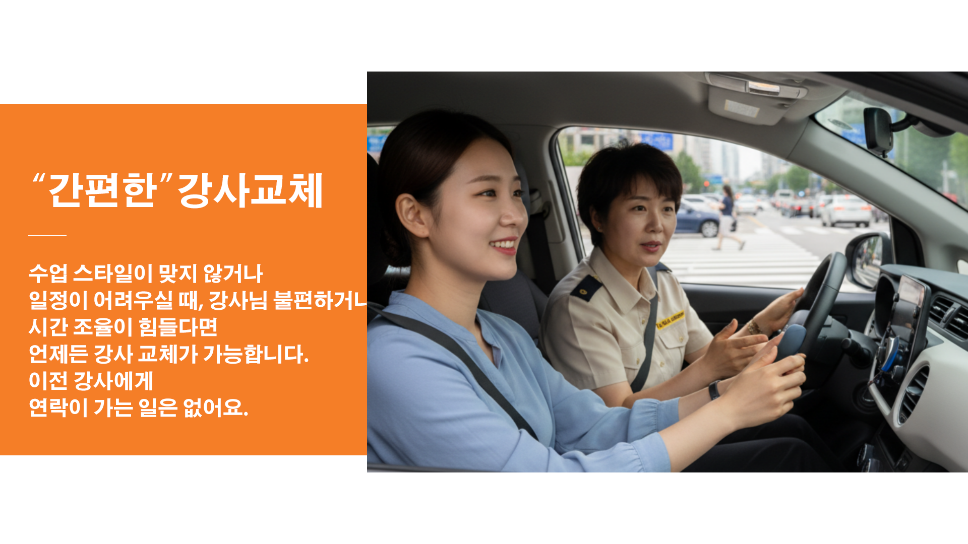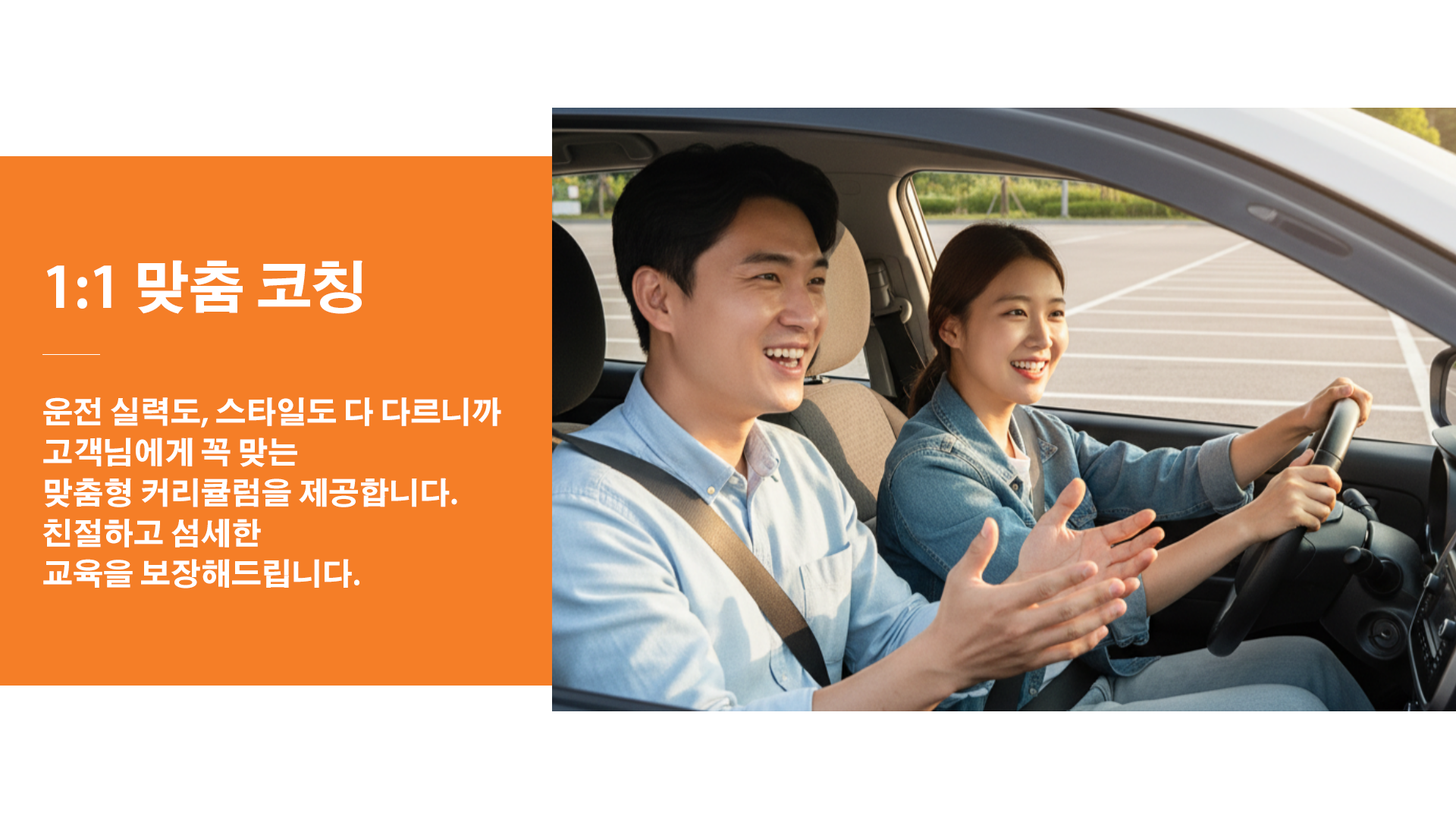 A2. 강사가 직접 동승하여 차량 점검 후, 기초 조작부터 주행·차로 변경·주차·교차로 진입 등 실제 도로 환경 중심으로 1:1 맞춤형으로 진행됩니다.